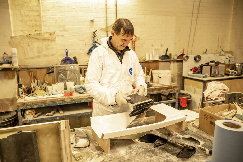 Not everyone in the company is a youngster. In the pattern making shop a couple of experienced craftsmen are planing and shaping patterns from which female moulds will be taken which will then in turn be used to make production components. Most of the cars’s bodywork is made from fibreglass, including the large one-piece front ends.