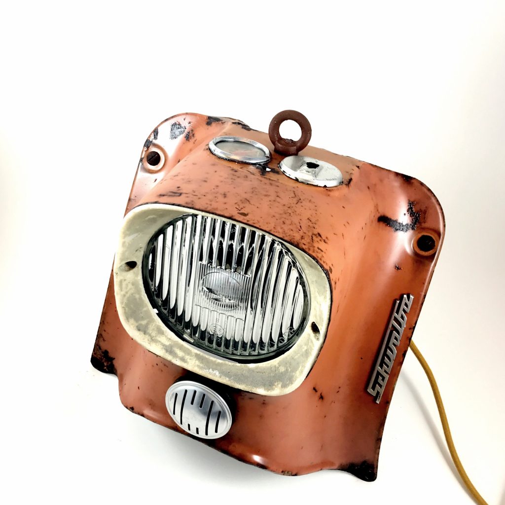 The biggest design challenge was creating an “aesthetic connection” between the old original parts – which included a weathered front body panel, headlight and tachometer – and the “dismal looking” modern electrical components. Unsatisfied with the results he was getting, Philipp started again several times, but ultimately a birthday can’t be postponed. “It took a couple of night shifts, but the lamp was ready on time.”